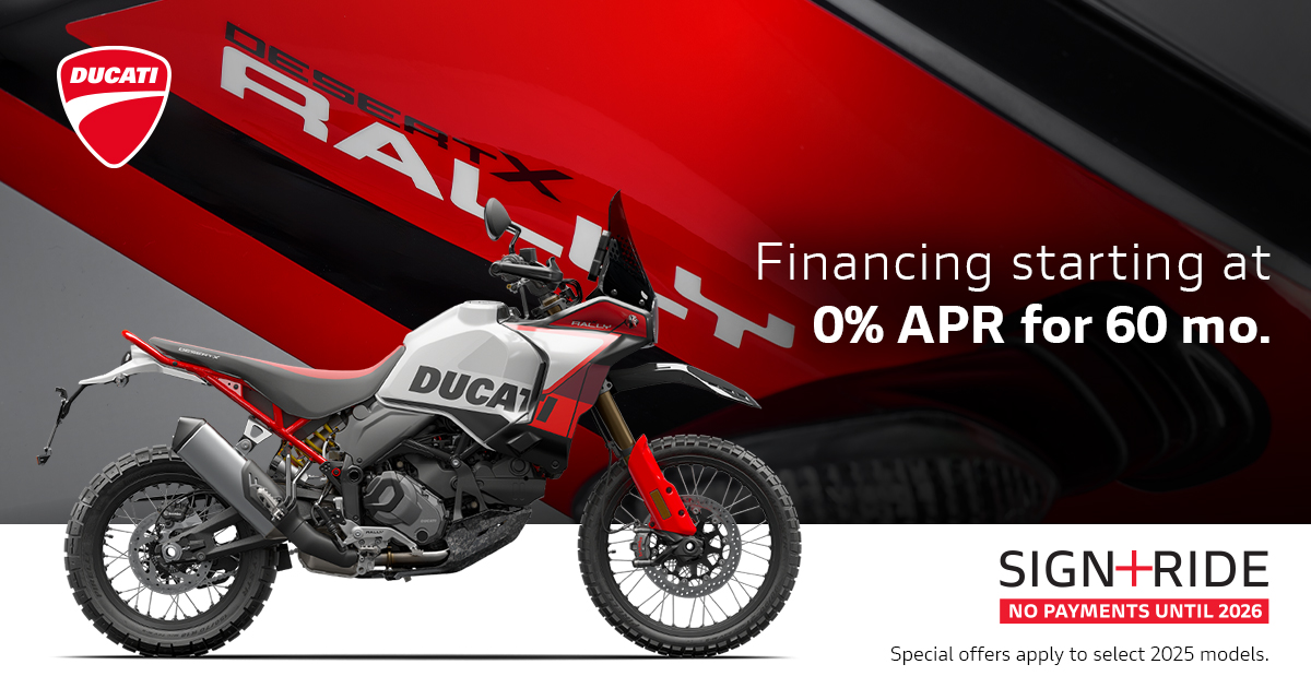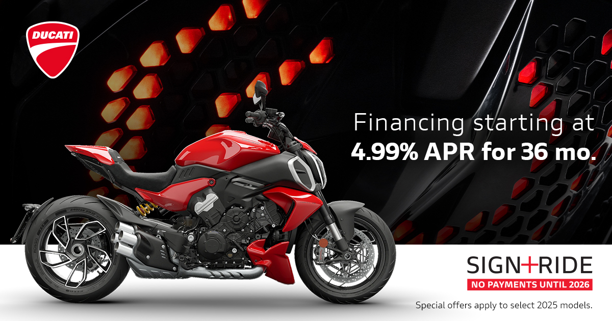 Offer available on select 2024 and 2025 models to highly qualified customers on approved credit by Ducati Financial Services through participating and authorized Ducati dealers from October 1 - 31, 2025. Down payment requirement varies from 0%-25% of the purchase price based on credit worthiness. Not all customers will qualify for the advertised APR. Minimum amount financed is $5,000. See your local Ducati dealer for financing details or, for general product information, call 1-888-391-5446. VW Credit, Inc. dba Ducati Financial Services is a servicer for VCI Loan Services, LLC. © 2025 Ducati North America.