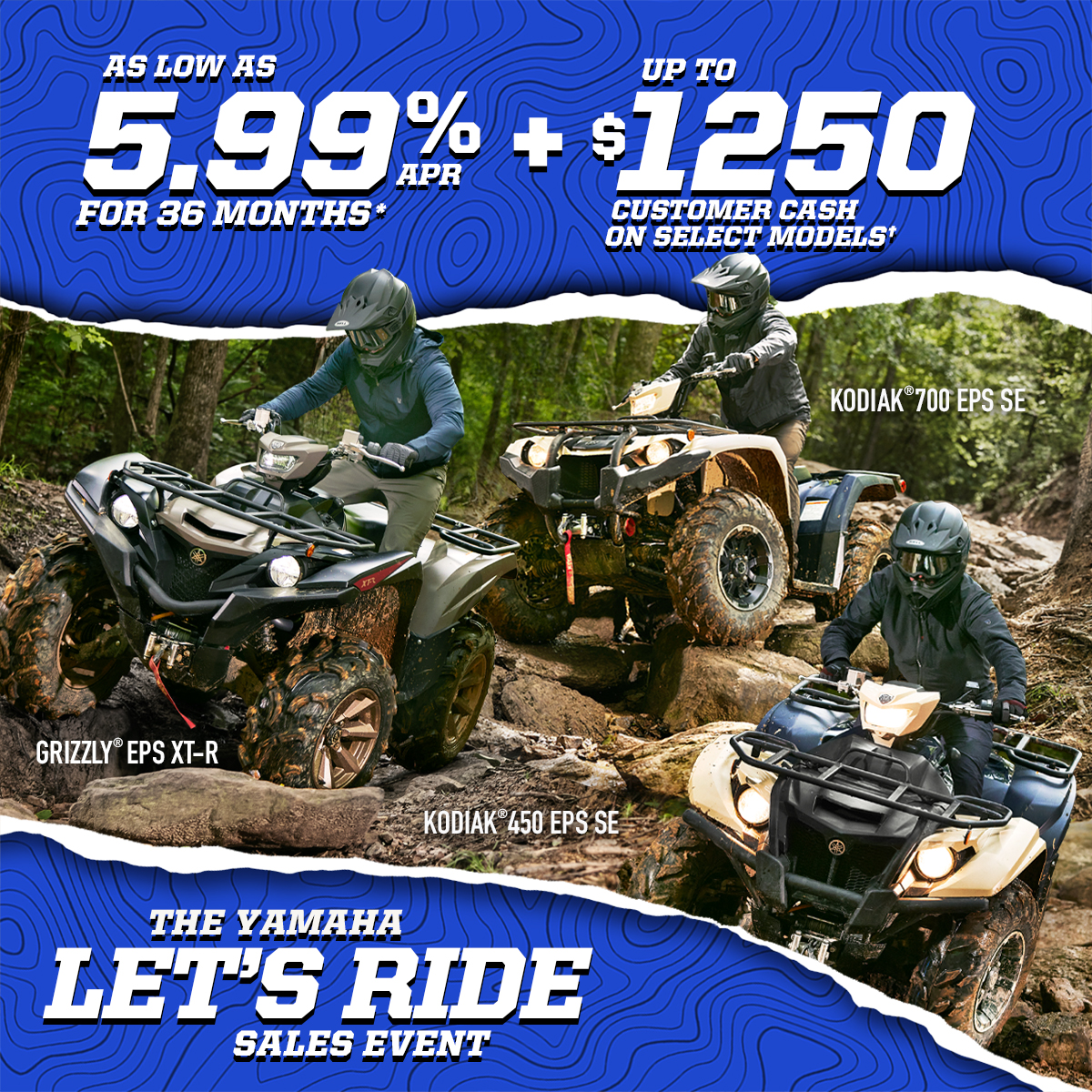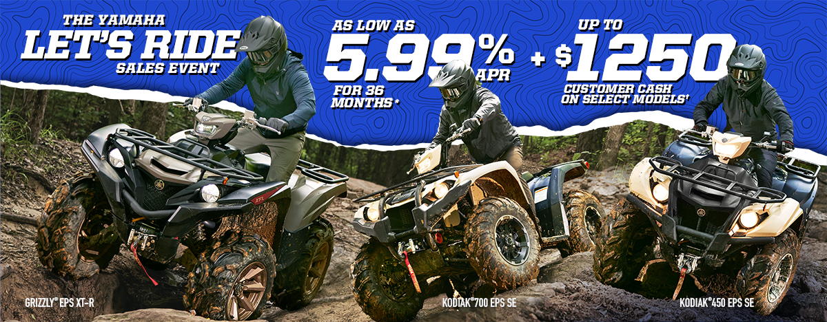 *Offer available on approved purchases of new 2023 – 2026 Yamaha ATVs made on the Yamaha Credit Card issued by WebBank. Offer valid 10/1/2025 – 12/31/2025. Account must be open and current to be eligible for this offer. Promotional 5.99%, 7.99%, 14.49%, 21.99% APR financing with minimum payments of 3.05%, 3.14%, 3.45%, or 3.82% are effective until the purchase is paid in full. Minimum interest charge $2 per month. Promotional rates are based on creditworthiness. Not all applicants will qualify.