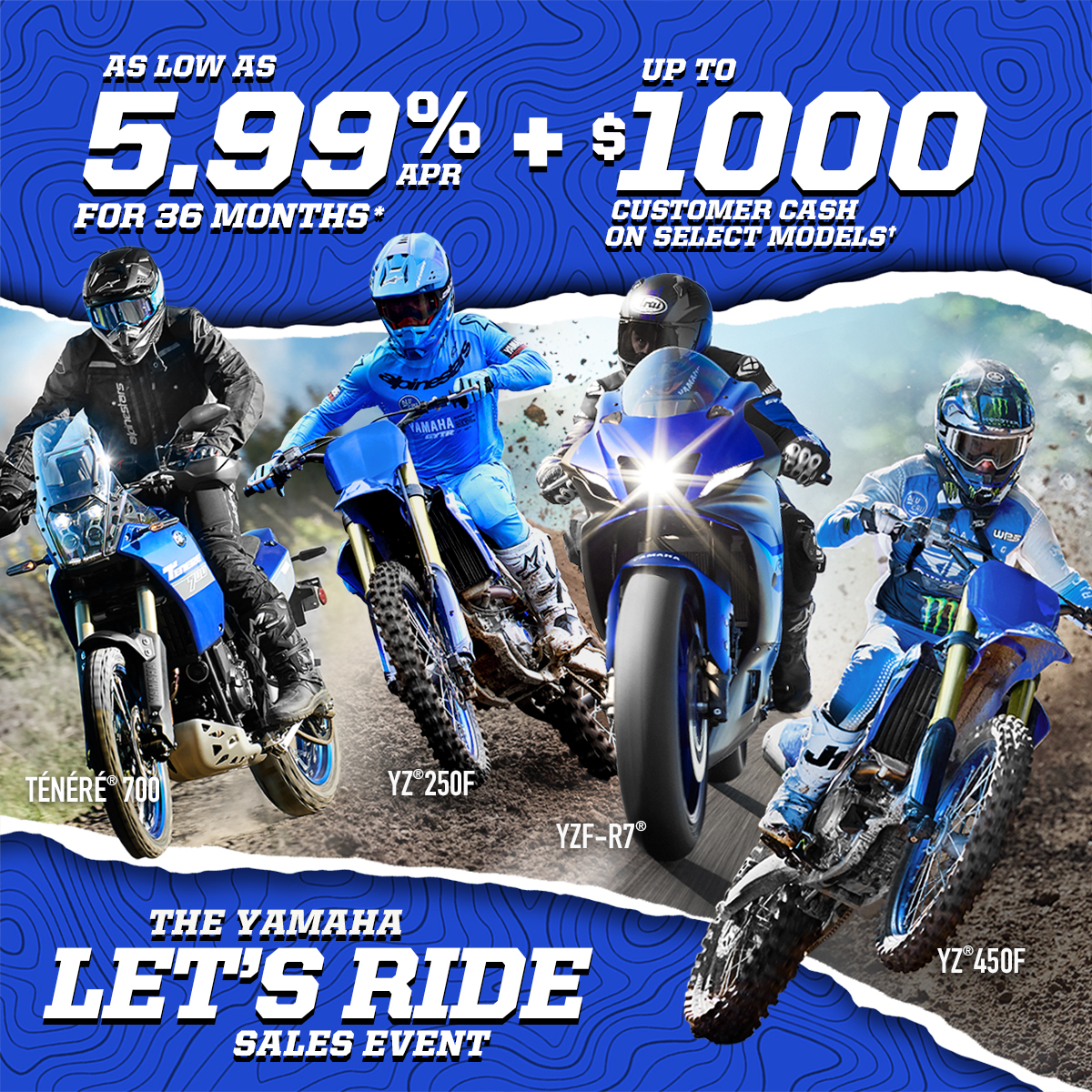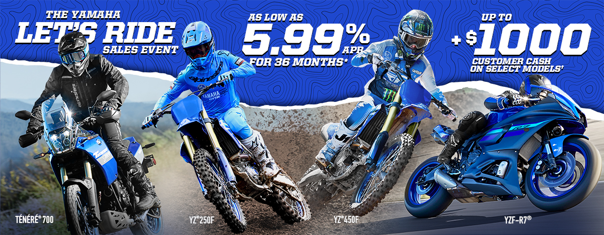 *Offer available on approved purchases of new 2023 – 2026 Yamaha Motorcycles made on the Yamaha Credit Card issued by WebBank. Offer valid 10/1/2025 – 12/31/2025. Account must be open and current to be eligible for this offer. Promotional 5.99%, 7.99%, 14.49%, 21.99% APR financing with minimum payments of 3.05%, 3.14%, 3.45%, or 3.82% are effective until the purchase is paid in full. Minimum interest charge $2 per month. Promotional rates are based on creditworthiness. Not all applicants will qualify.