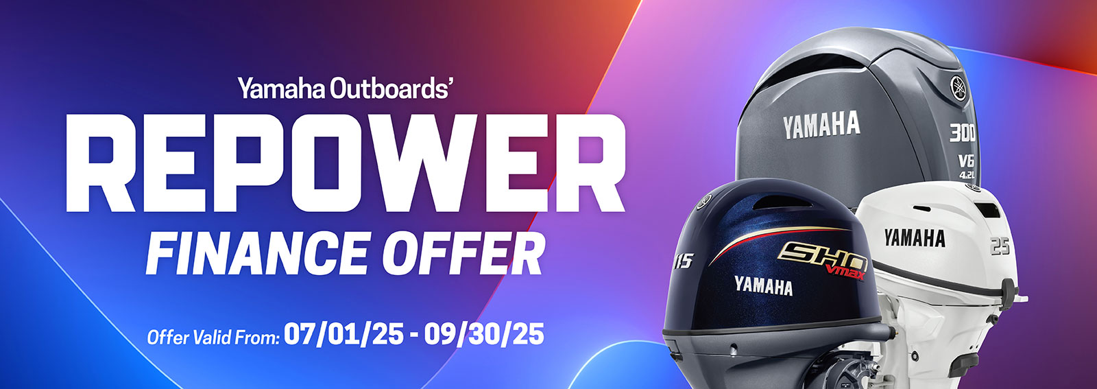 PROGRAM TERMS AND CONDITIONS: Available on approved purchases of new (unused and not previously warranty registered) V6 4.2L 225/250/300HP: DEC Non-Integrated Steering Yamaha outboard motors only (does not include V Max SHO V6 4.2L outboard motors) manufactured since January 2019 made on the Yamaha Credit Card issued by WebBank. Offer valid 10/1/2025 – 12/31/2025. Account must be open and current to be eligible for this offer. Introductory 0% APR for tier 1 - 3 financing with minimum payments of 1.00% of the purchase price balance are effective for initial 12 months based on creditworthiness. After the 12-month introductory period, standard APR 15.99%, 18.99%, 20.99% with minimum monthly payments shall be due equal to the greater of 1% of existing balance plus standard interest charges based on creditworthiness, late fees and late payment amounts, or $25 until the purchase price is paid in full. Minimum interest charge $2 per month. Promotional rates are based on creditworthiness. Not all applicants will qualify.