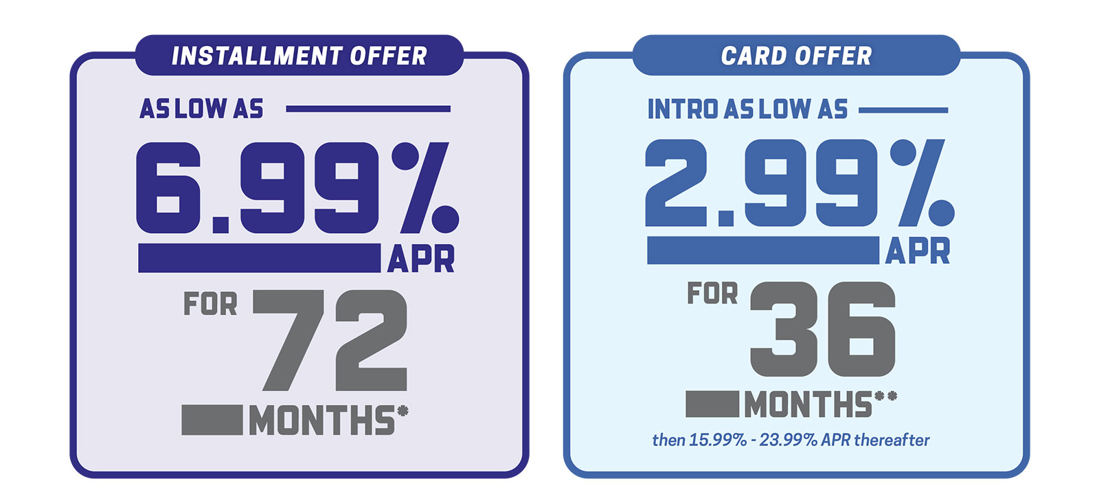 INTRO AS LOW AS 6.99% APR FOR 24 MONTHS, AS LOW AS 15.99% APR THEREAFTER1